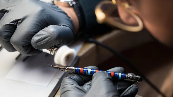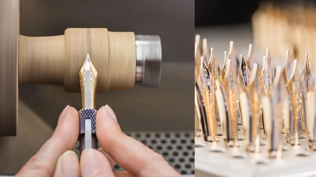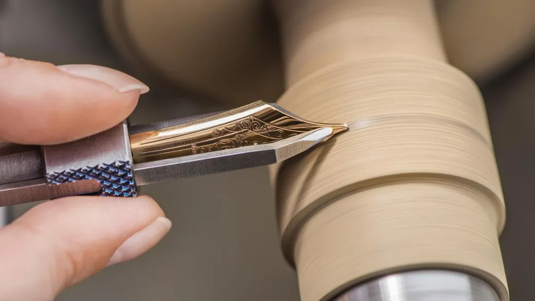 his gold-plated fountain pen features a piston converter for the optional use of ink cartridges and a handcrafted nib made of 14-karat gold with rhodium inlays. To express your individual personality, Montblanc offers a free engraving service with names or initials.