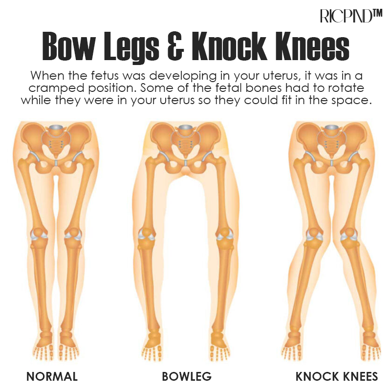 When babies are born with bow legs it's because some of the bones had to rotate (twist) slightly when they were growing in the womb to fit into the small space. This is called physiologic bow legs. It's considered a normal part of a child's growth and development. Vitamin D deficiency (rickets = occurs especially in children; deformation of the bones) Hip joint dislocations (in case of unilateral malalignment) Incorrect load on the joints.