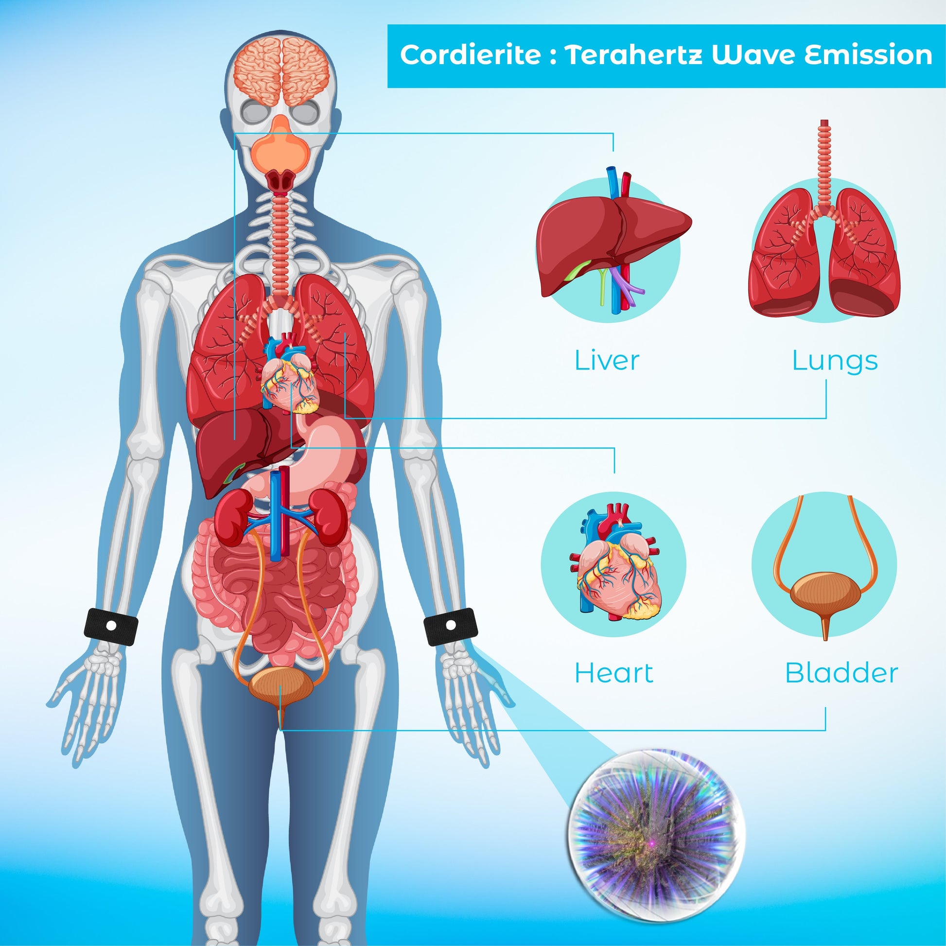 Cordierite emits electromagnetic waves at a frequency exceeding 1 trillion hertz per second, potentially providing health advantages. These terahertz waves have the capability to protect the body against detrimental electromagnetic radiation, manage blood pressure, improve the oxygen-carrying capacity of red blood cells, and assist in reducing blood sugar and cholesterol levels. They have the potential to activate dormant organs such as the liver, pancreas, spleen, and kidneys, fostering metabolic equilibrium and supporting the body's inherent sugar processing mechanisms.