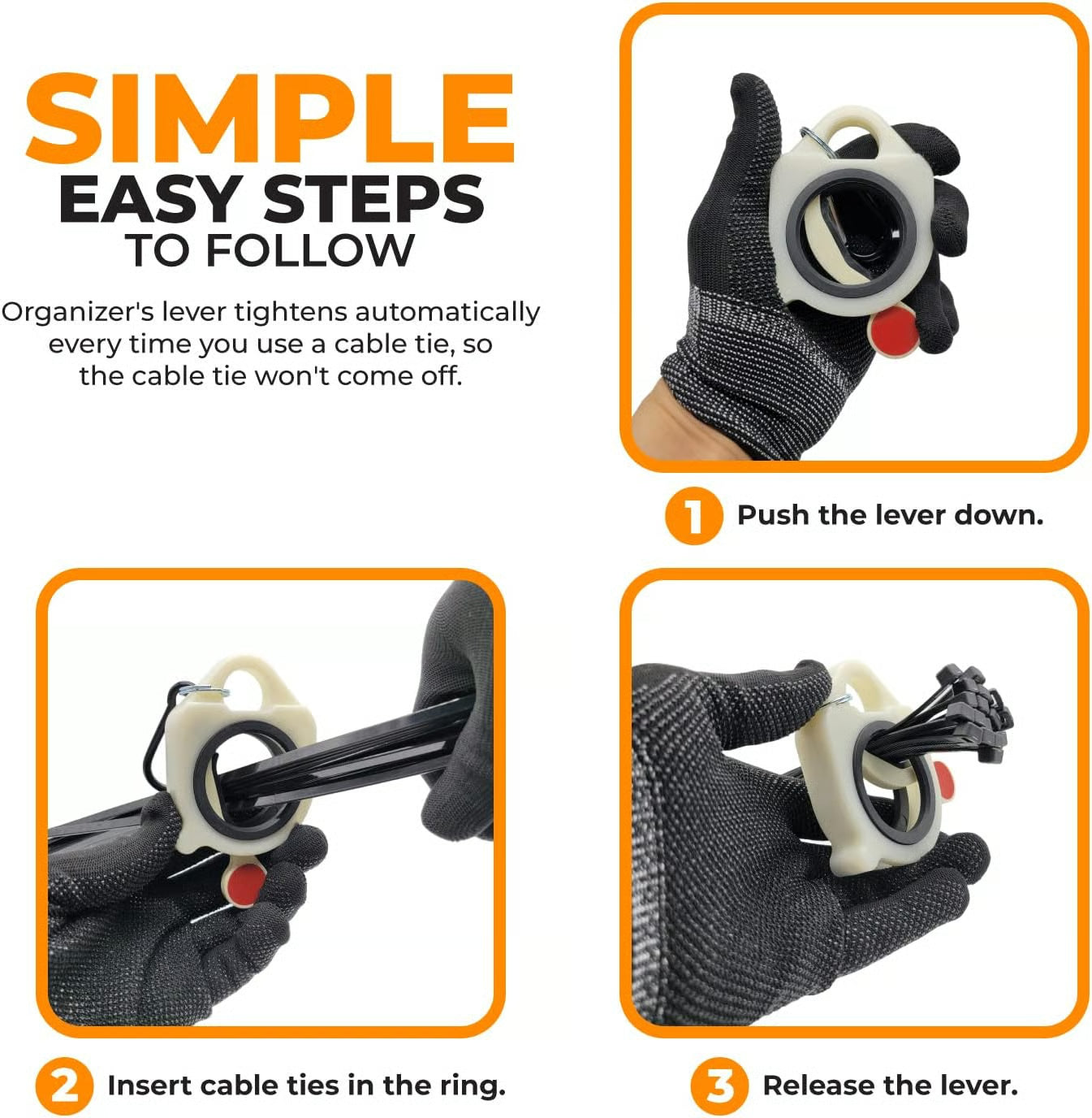 AUTOMATIC-Organizer's lever tightens automatically every time you use a cable tie, so the cable tie won't come off.