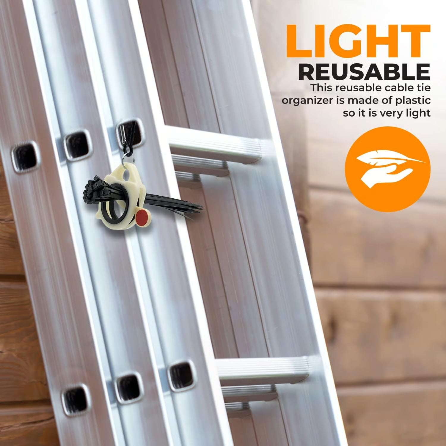LIGHT AND REUSABLE-This reusable cable tie organizer is made of plastic so it is very light.